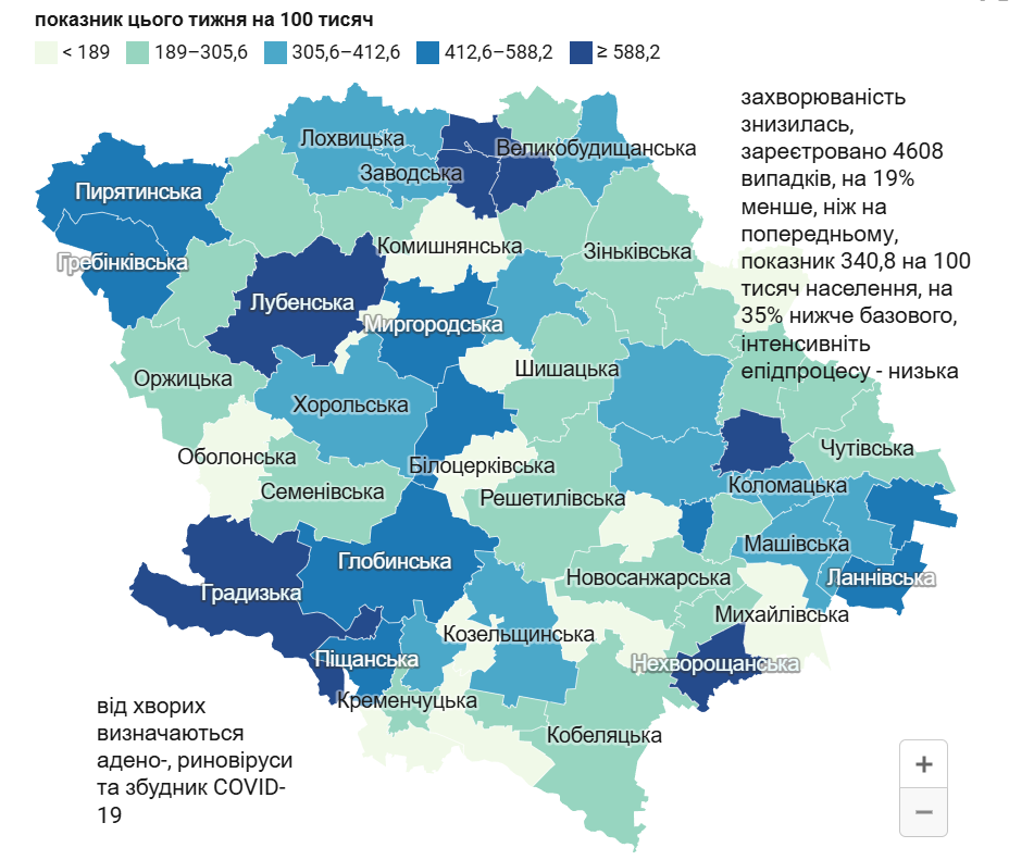 Минулого тижня в області до лікарів звернулися 4 тисячі 608 людей із симптомами гострих респіраторних інфекцій, що на 19% менше попереднього тижня. Серед них у 15 людей підтвердили COVID-19. Показник захворюваності на ГРВІ на Полтавщині становить 340,8 на 100 тисяч населення. Госпіталізовані 138 хворих.
