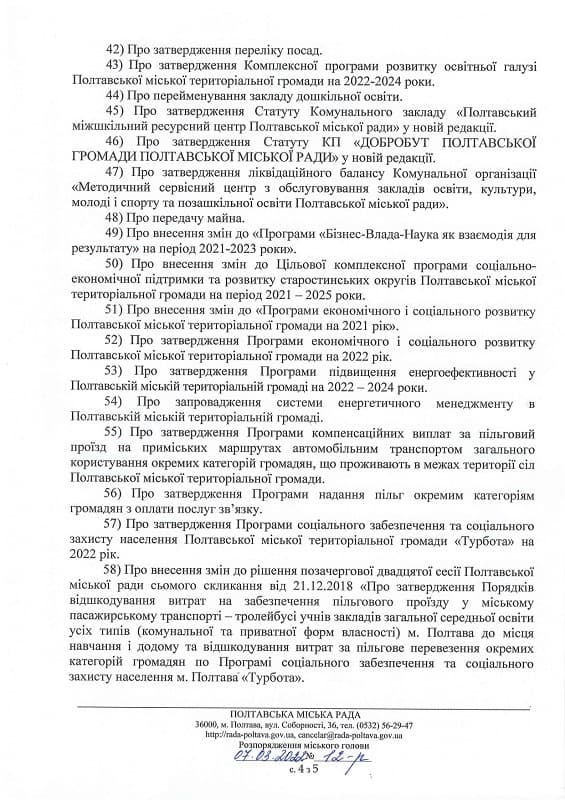 Депутат Міськради Юрій Бражник каже, що усі заплановані об’єкти відкладають. 6 березня склали новий бюджет Полтавської громади, що включає захищені статті витрат – заробітні плати працівникам шкіл, медзакладів та усіх комунальних установ. Також планується підтримка комунальних підприємств, аби вони продовжували підтримувати життєдіяльність міста в умовах воєнного стану.