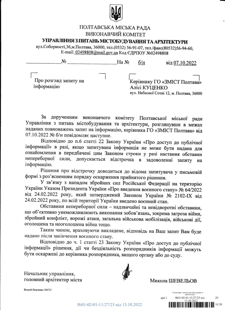 Управління архітектури відмовилося надати протоколи засідань Комісії з розміщення тимчасових споруд для здійснення підприємницької діяльності на території Полтави. Причиною називають повномасштабну війну.