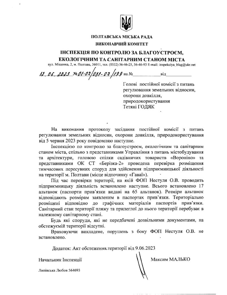 Після цього Інспекція з благоустрою виїхала на місце й засвідчила, що не бачить жодних порушень. Надалі питання розглядатиме земельна комісія Полтавської міської ради.