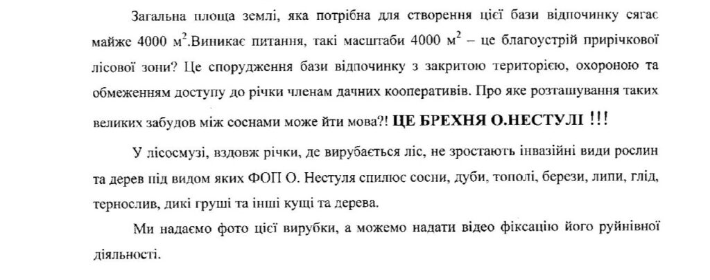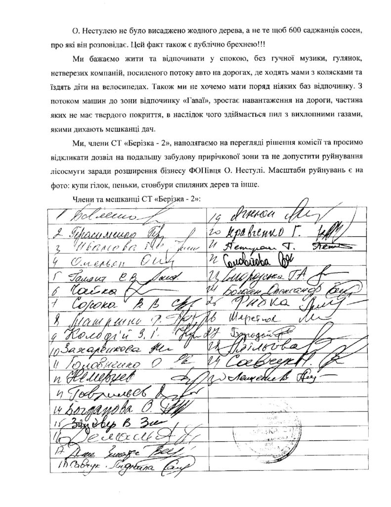 Місцеві мешканці не зупинилися й звернулися до земельної комісії з вимогою до Полтавської міської ради, аби влада простежила виконання планів по створення місця відпочинку. 1 червня ОСТ «Берізка» надіслали звернення з підписами й закликали відкликати дозвіл на облаштування відпочинкової зони, бо вважають усе, що каже підприємець брехнею, бо, за їхніми словами, Нестуля випилював дерева у попередні роки.