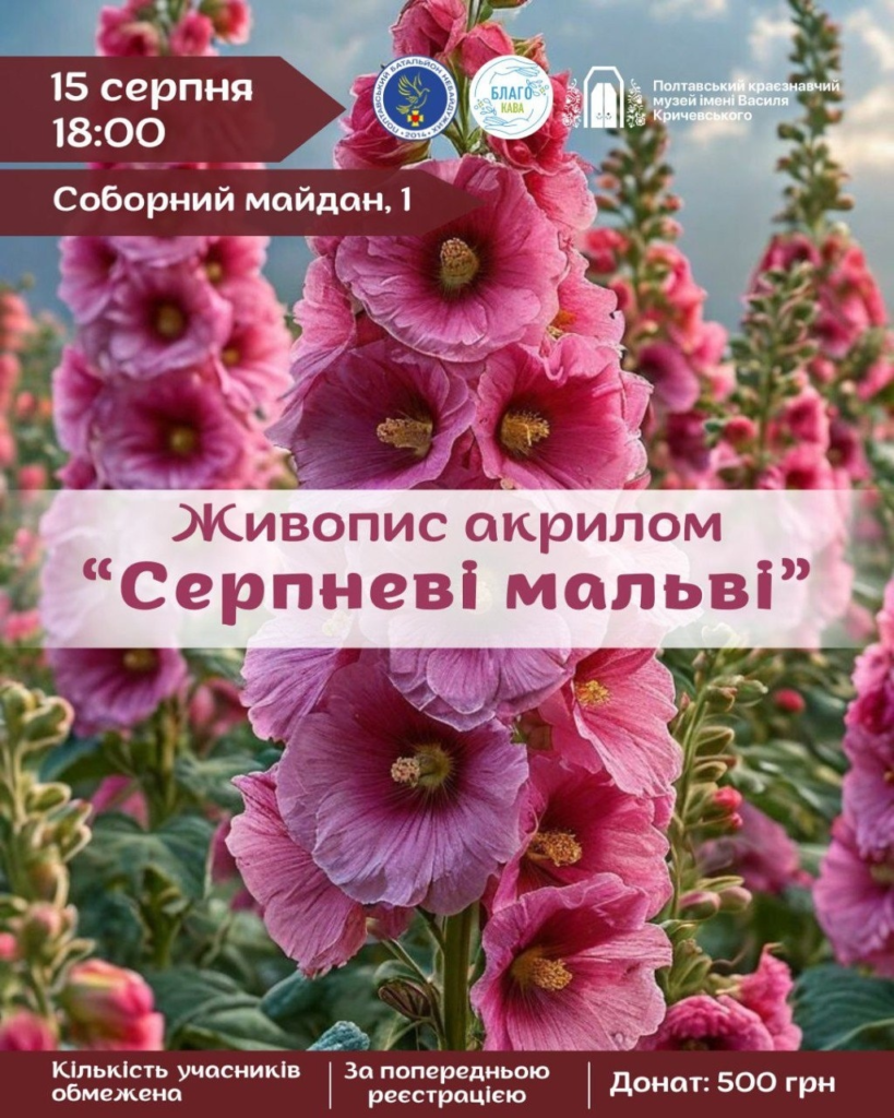 Арт-майстерка «Серпневі мальви» з художницею Оленою Поміновою. Учасники зможуть створити власну картину, навчившись працювати з кольором, формою та фактурою без попереднього досвіду. Усі матеріали – полотно, мольберт, фарби та пензлі надають.