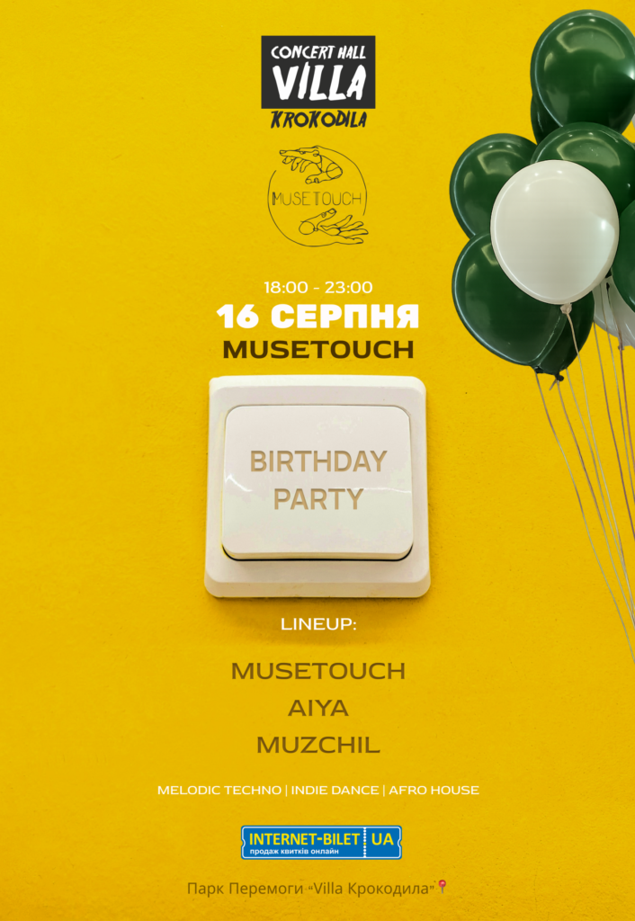 У Concert Hall «Villa Крокодила» відбудеться вечірка з нагоди дня народження MUSЕTOUCH. У лайн-апі – MUSЕTOUCH, AIYA та MUZCHIL. Гостей чекає електронна музика у стилях Melodic Techno, Indie Dance та Afro House.