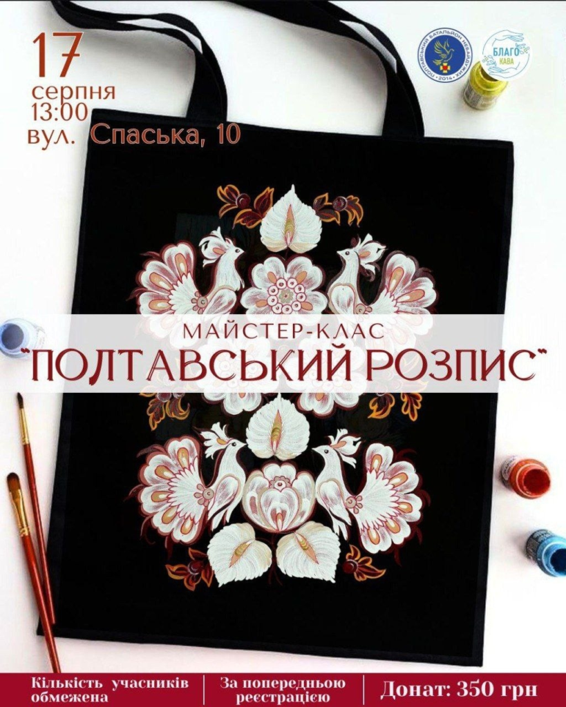 Майстер-клас із розпису шоперів у техніці полтавського розпису. Разом із майстринями Лідією Орел та Наталією Сташкевич учасники дізнаються про символіку, кольори й техніки цього мистецтва та створять власну стильну річ.