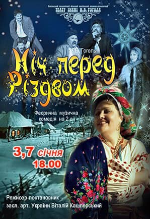 Також 3 і 7 у театрі гратимуть виставу «Ніч перед Різдвом» – феєрична музична комедія на 2 дії. У музичній комедії грають понад 20 акторів. Вартість квитка від 80 грн. Придбати можна за посиланням.