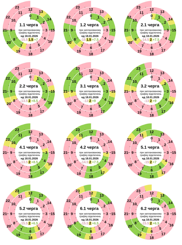 Знеструмлення охоплюють шість черг споживачів. Вони триватимуть від 3 год до 4,5 год для кожної з черг у різний час доби: