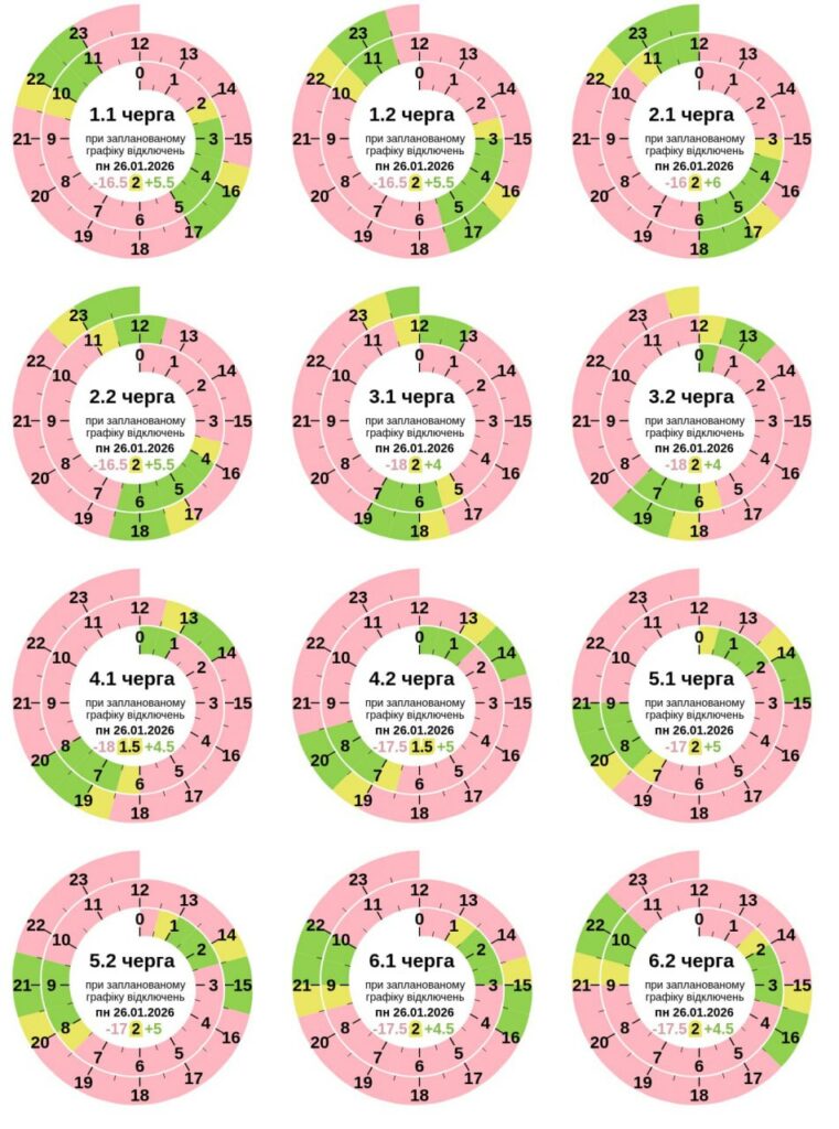 Паралельно з 0:00 до 23:59 26 січня діятимуть графіки обмеження споживання електричної потужності для бізнесу в обсязі пʼяти черг.