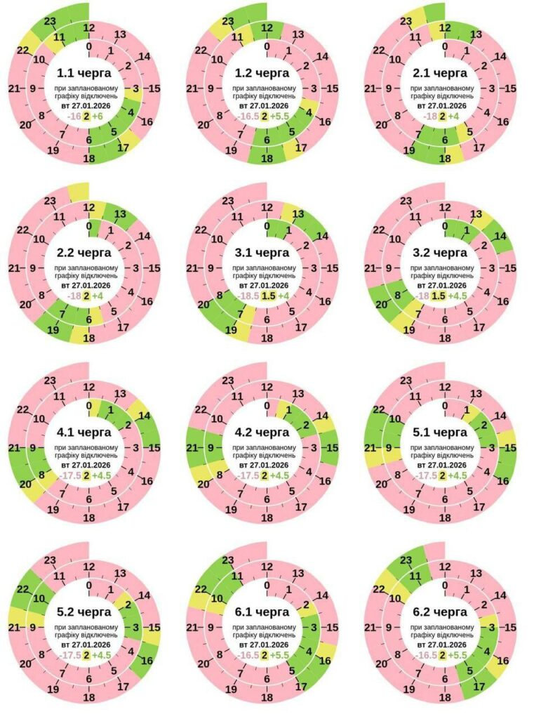 Паралельно з 0:00 до 23:59 27 січня діятимуть графіки обмеження споживання електричної потужності для бізнесу в обсязі пʼяти черг.