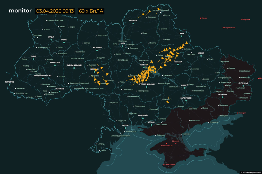 Перші повідомлення про загрозу з’явилися ще напередодні ввечері, а групи дронів продовжують маневрувати над областю 3 квітня. За даними Повітряних сил ЗСУ, OSINT-каналу «Розвідка України» та Monitor, рух безпілотників зафіксували у районах області.