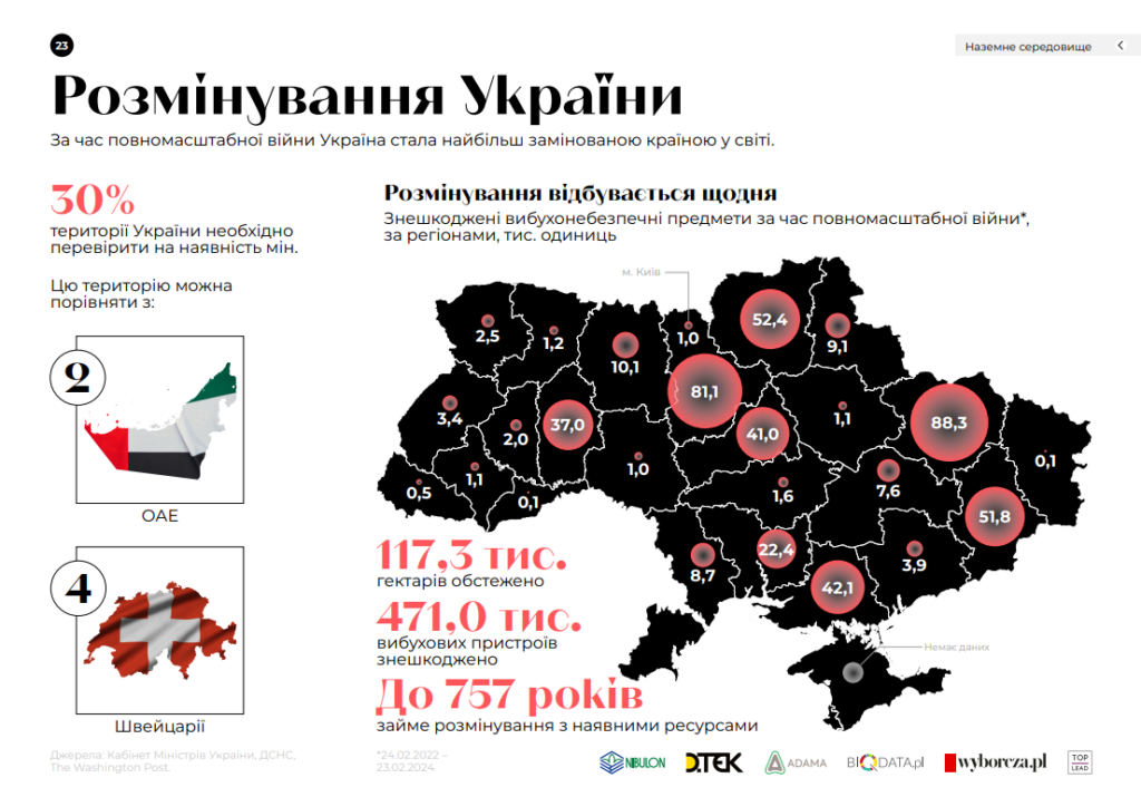 З 24 лютого 2022 року до 23 лютого 2024 року на території країни знешкодили 471 тис. боєприпасів. Загалом вибухотехніки дослідили 117,3 тис. га території країни.