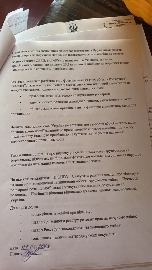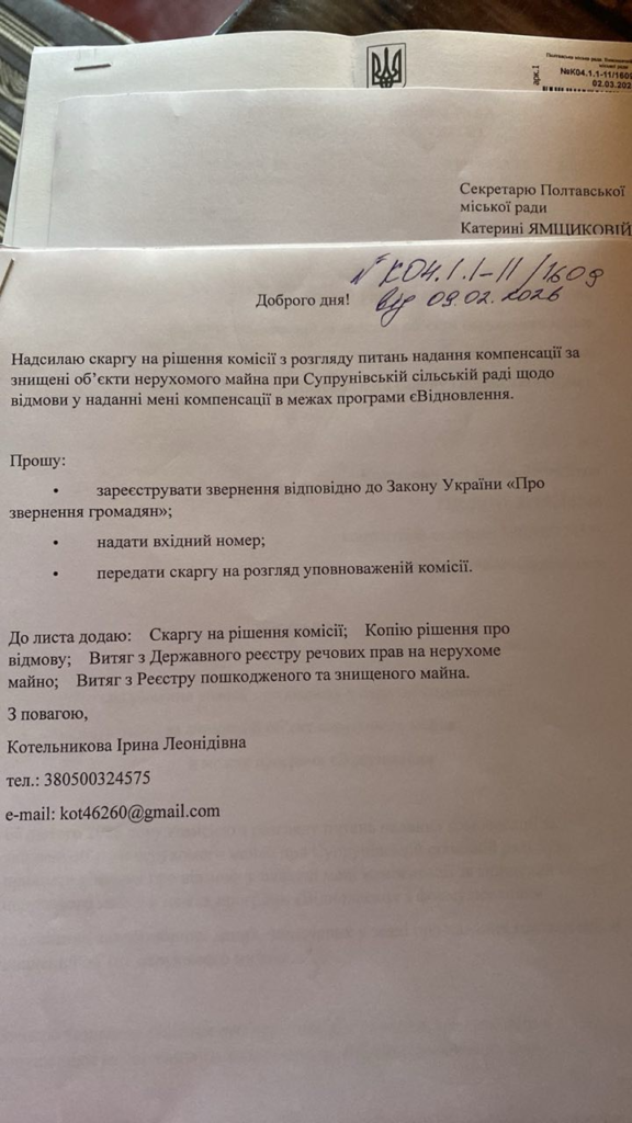 Згідно з документами, комісія з розгляду питань компенсації при Супрунівській сільській раді продовжує відмовляти у видачі житлового сертифіката. Останню відмову датовано лютим 2026 року.
