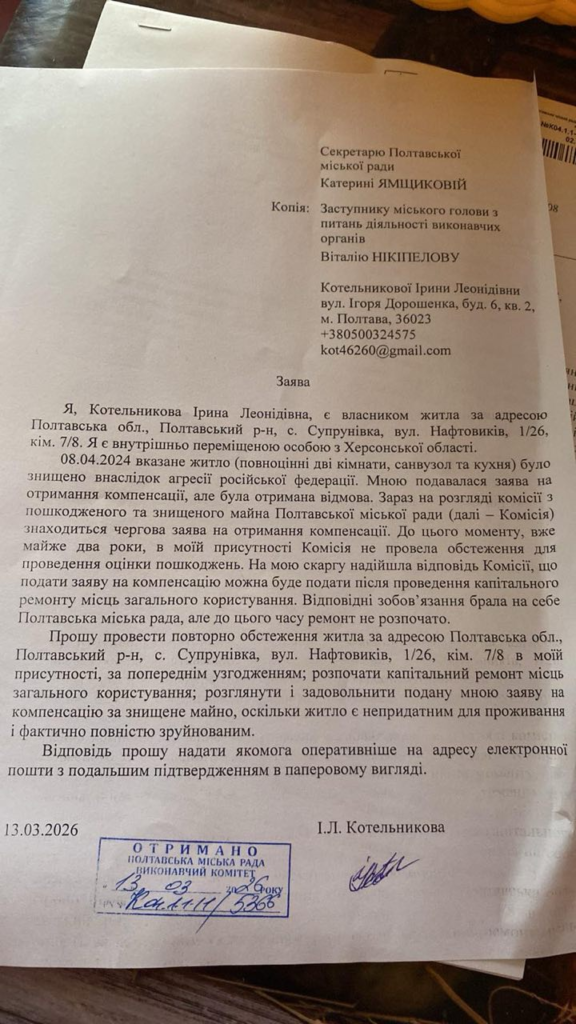 Причиною люди називають бюрократичні перепони та формальні відмови з боку комісії. Про те, що жителі гуртожитку у Супрунівці досі не можуть отримати компенсацію, повідомила постраждала Ірина Котельникова інтернет-виданню «Полтавщина»