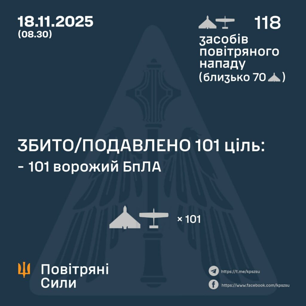 Повітряні Сили ЗСУ 18 листопада повідомили про результати бойової роботи. У ніч на 18 листопада росіяни атакували Україну з різних напрямків.