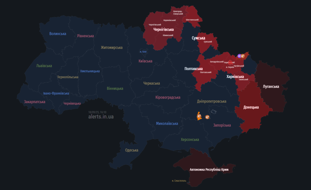 16:07 – повітряна тривога на Полтавщині. Існує загроза застосування ворогом ударних дронів з Харківщини – Повітряні Сили.