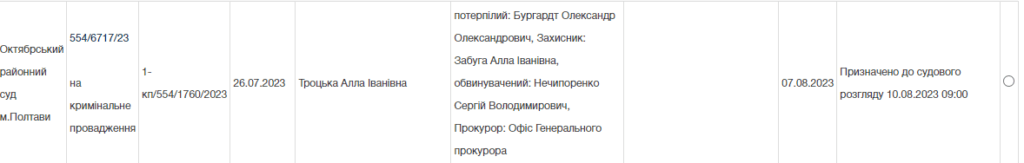 До суду передали обвинувальний акт щодо підозрюваного, але підготовче засідання кілька разів переносили. 7 серпня Октябрський районний суд вкотре не зміг розглянути справу, бо підозрюваний просить знайти йому іншого безкоштовного адвоката.