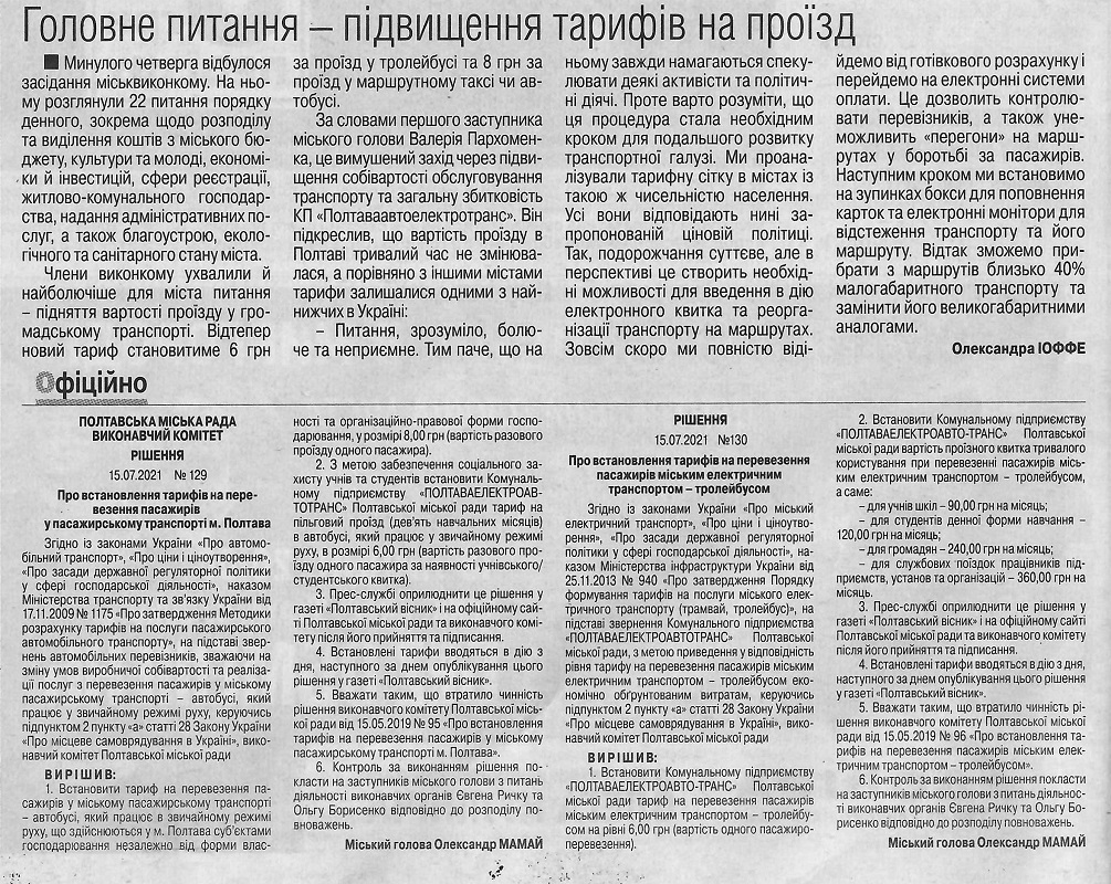 15 липня члени виконкому підтримали підвищення вартості проїзду у громадському транспорті. 16 липня це рішення оприлюднили у «Полтавському віснику».