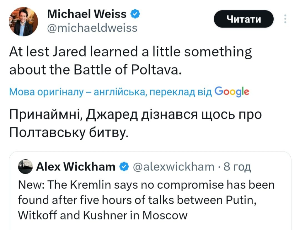 2 грудня у Кремлі відбулася зустріч зі спецпосланцем президента США Стівом Віткоффом і зятем Дональда Трампа Джаредом Кушнером. На зустрічі могли обговорювати мирний план, повідомили в «Українській правді». Однією з тем стала й Полтавська битва.