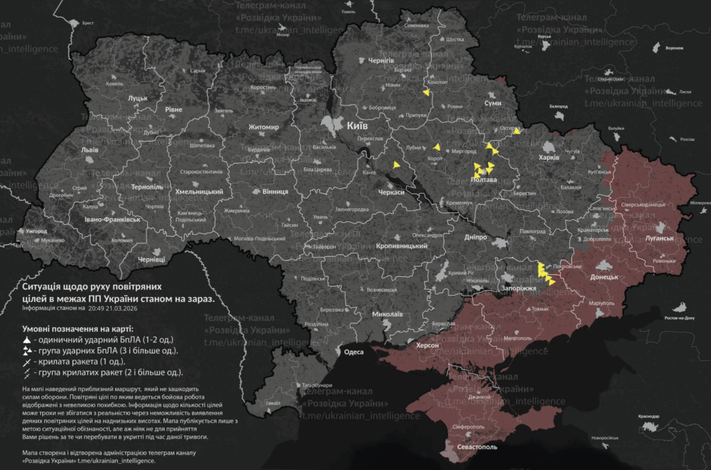 Увечері 21 березня російська армія почала запускати дрони в сторону Полтавщини. Під прицілом опинилися Полтава, Миргород, Кременчук та інші міста та села області. Повітряні Сили ЗСУ та моніторингові канали повідомляли про безпілотники над регіоном у ніч на 22 березня.