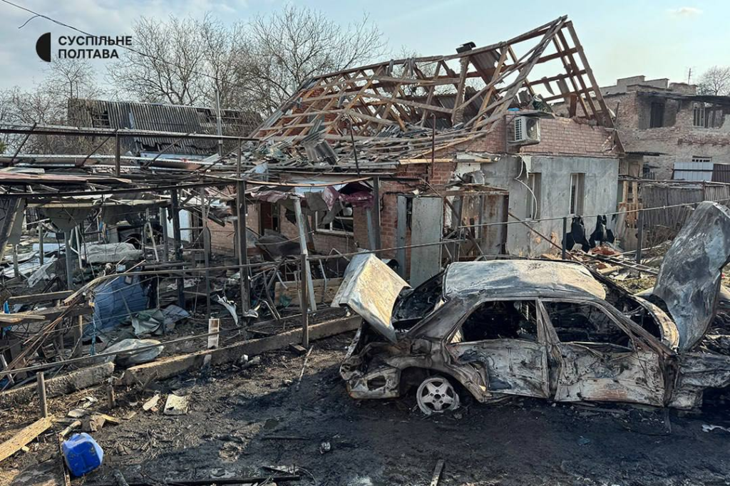 Зафіксовані руйнування трьох приватних будівель та автомобілів. Про пошкоджені будинки повідомили 1 квітня у Полтавському обласному територіальному центрі комплектування та соціальної підтримки.
