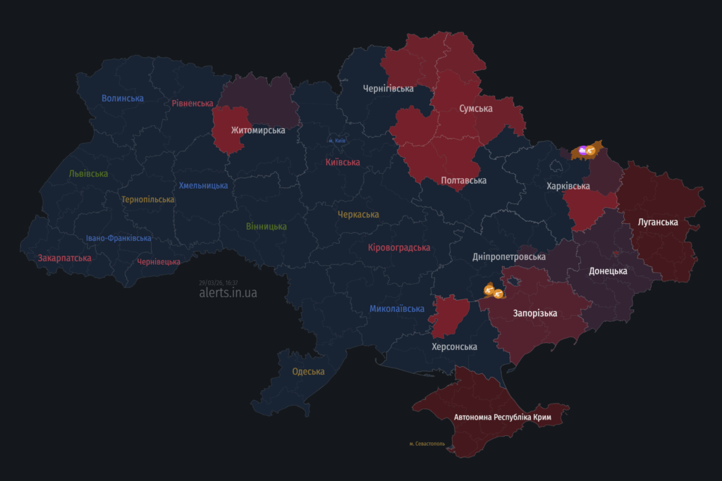 ЗМІСТ писав, що у ніч проти 29 березня кілька хвиль російських безпілотників заходили в повітряний простір області з різних напрямків. Повітряна небезпека тривала всю ніч і триває нині. У Полтавському районі повітряна тривога тривала понад 13 годин. Повітряні Сили ЗСУ та моніторингові канали повідомляли про дрони над областю у ніч на 29 березня.