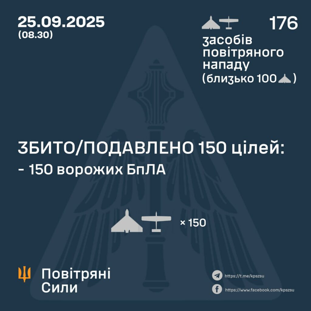 За попередніми даними, станом на 08:30, протиповітряна оборона збила або подавила 150 ворожих БпЛА типу Shahed, Гербера і дронів інших типів на півночі, півдні, сході та в центрі країни.