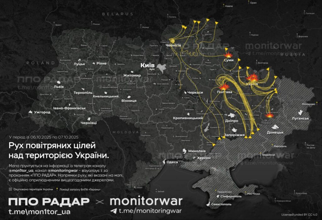 У ніч на 7 жовтня росіяни атакували Полтаву. У Київському та Подільському районах лунають вибухи. Цієї ночі росіяни завдали безпілотних ударів по Харкову та Полтаві. Ворог застосовував тактику одночасної атаки декількома групами на місто, через це хвилини між вибухами майже не було.