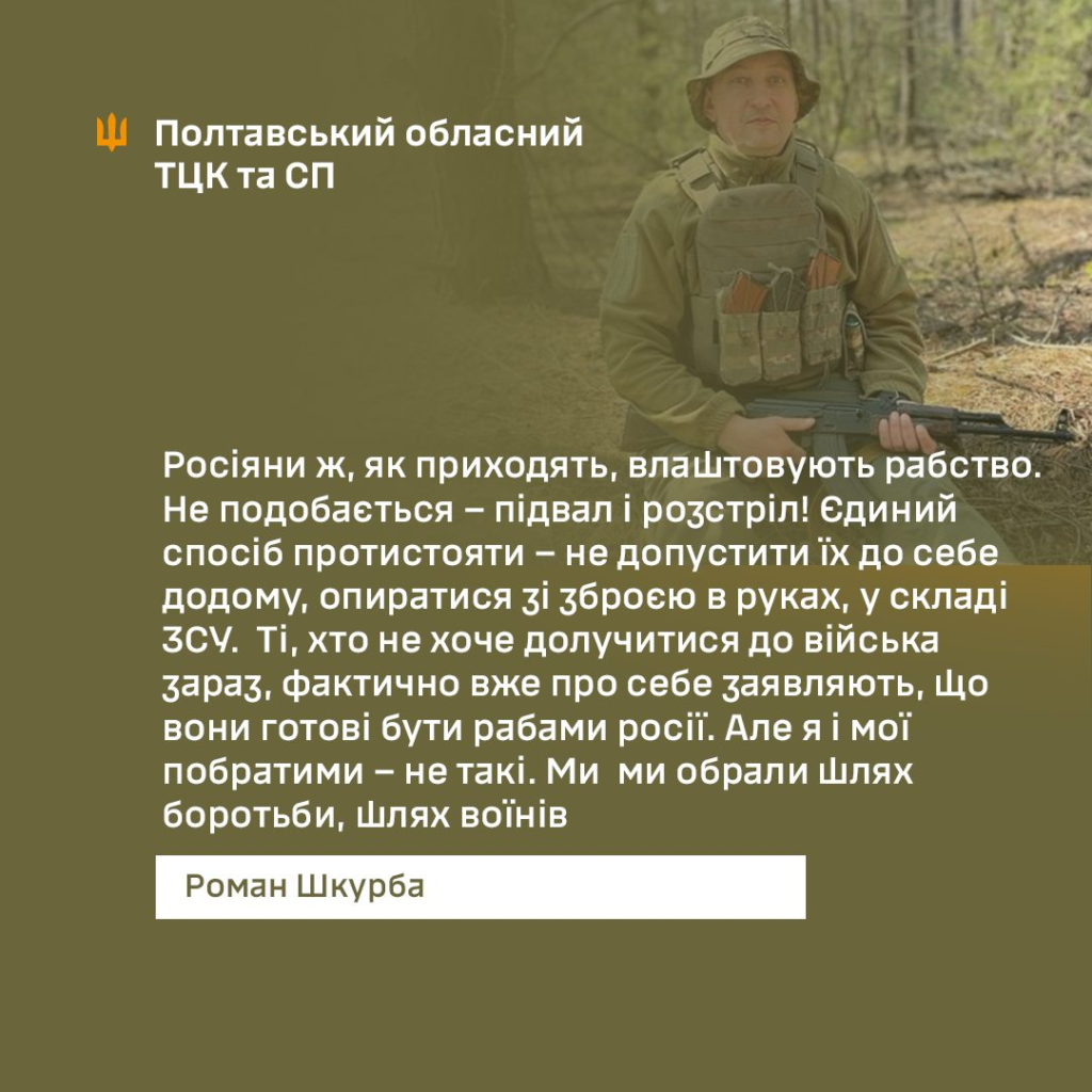 51-річний полтавець Роман Шкурба ще донедавна працював слюсарем у локомотивному депо «Укрзалізниці». Коли навесні 2022 року при Полтавському районному ТЦК та СП створили окремий штурмовий загін «Одін», він знав багатьох бійців особисто й мріяв долучитися. Довелось переконувати керівників підприємства зняти бронювання, щоб піти захищати країну.