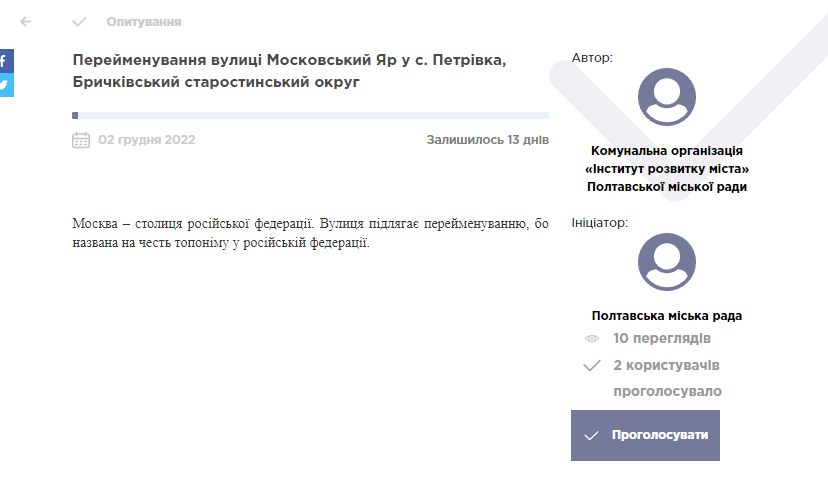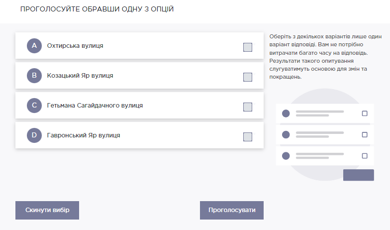 Наступним кроком є саме голосування за пропозиції. Після вибору, голос користувача враховує система і пропозиція, що отримає найбільшу підтримку серед людей, стане головною.