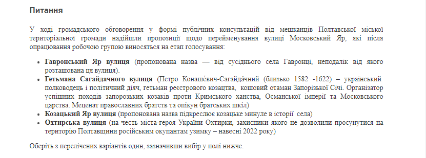 Розпочали голосування за нові назви вулиць у Полтаві: перша черга