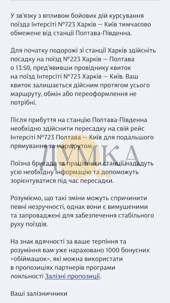 ЗМІСТ писав, що 17 березня пасажири, які встигли купити залізничні квитки на потяги №723 почали отримувати повідомлення про скасування прямого рейсу та наявність пересадки у Полтаві: