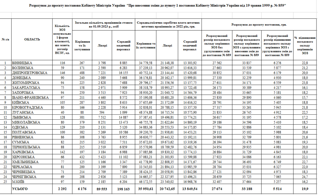 Зараз їхні оклади залежать від середніх окладів усіх медпрацівників закладів. За проєктом постанови, розрахунковий оклад керівників області нині становить 29 тис. 113 грн. Після змін він зросте на 20% – до 35 тис. 102 грн.