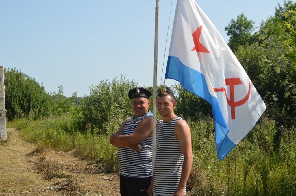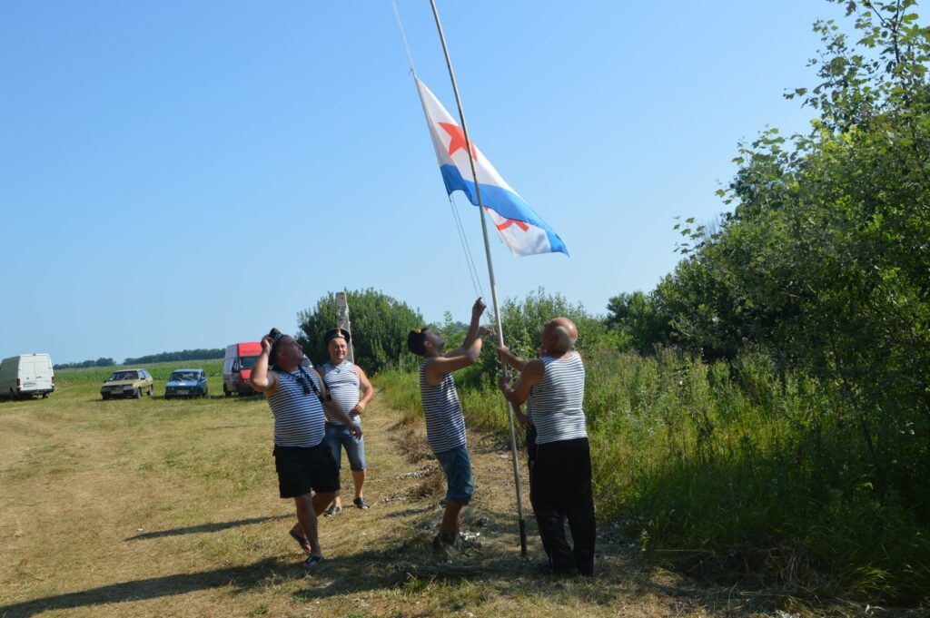 У Вишняках на Хорольщині використовували радянську символіку на прапорі та головних уборах під час відзначення Дня військово-морського флоту.