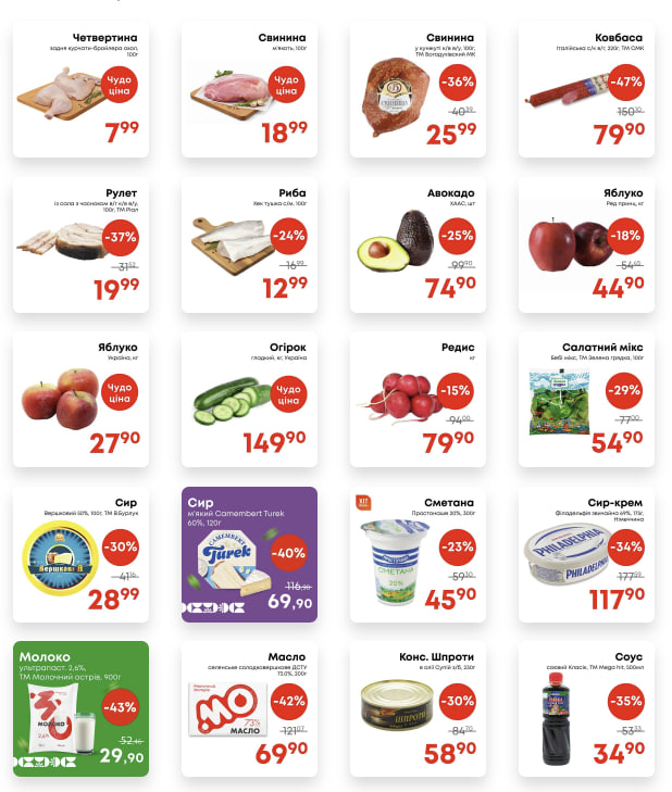 Цього тижня під акційні пропозиції потрапили товари з різних категорій. У супермаркеті відкритий великий вибір різноманітних товарів різних категорій. Полтавці можуть придбати зі знижками свіжу молочну продукцію, консерви, м'ясо або рибу.