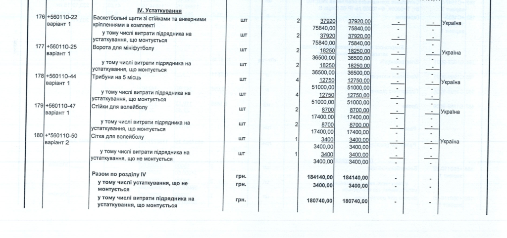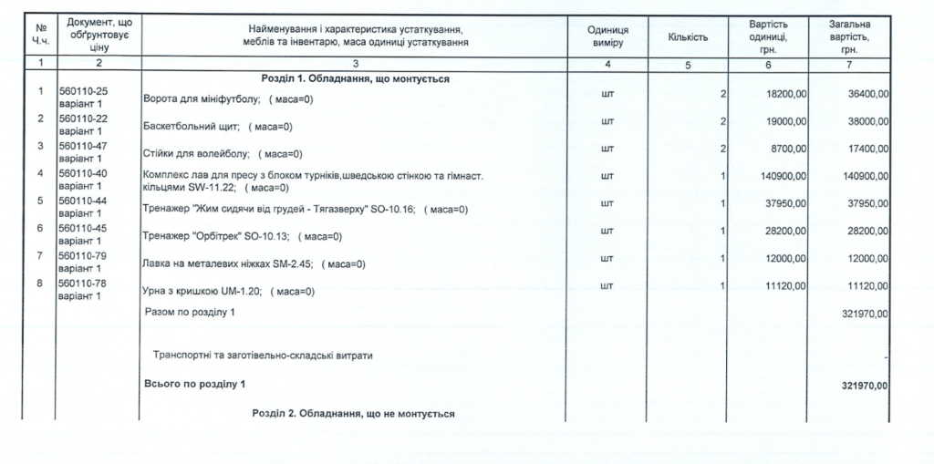 Кошторис спортивного майданчика по вул. Гожулівська, 18, розділ «Устаткування».