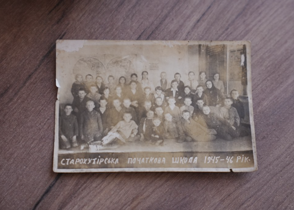 «Там вершок під час війни збили, сам кирпич. Її відремонтували, сам кирпич зняли перекрили залізом, покрили шифером. Тут була Марія Дмитрівна була вчителька і через певний час вона пішла до старших класів. А нас займала Надія Марківна, теж старохутірська вчителька. У мене карточка є. У 1945-46 році ходили сюди».