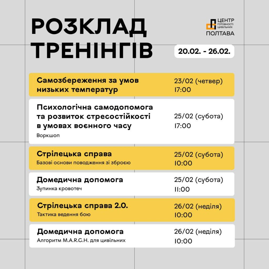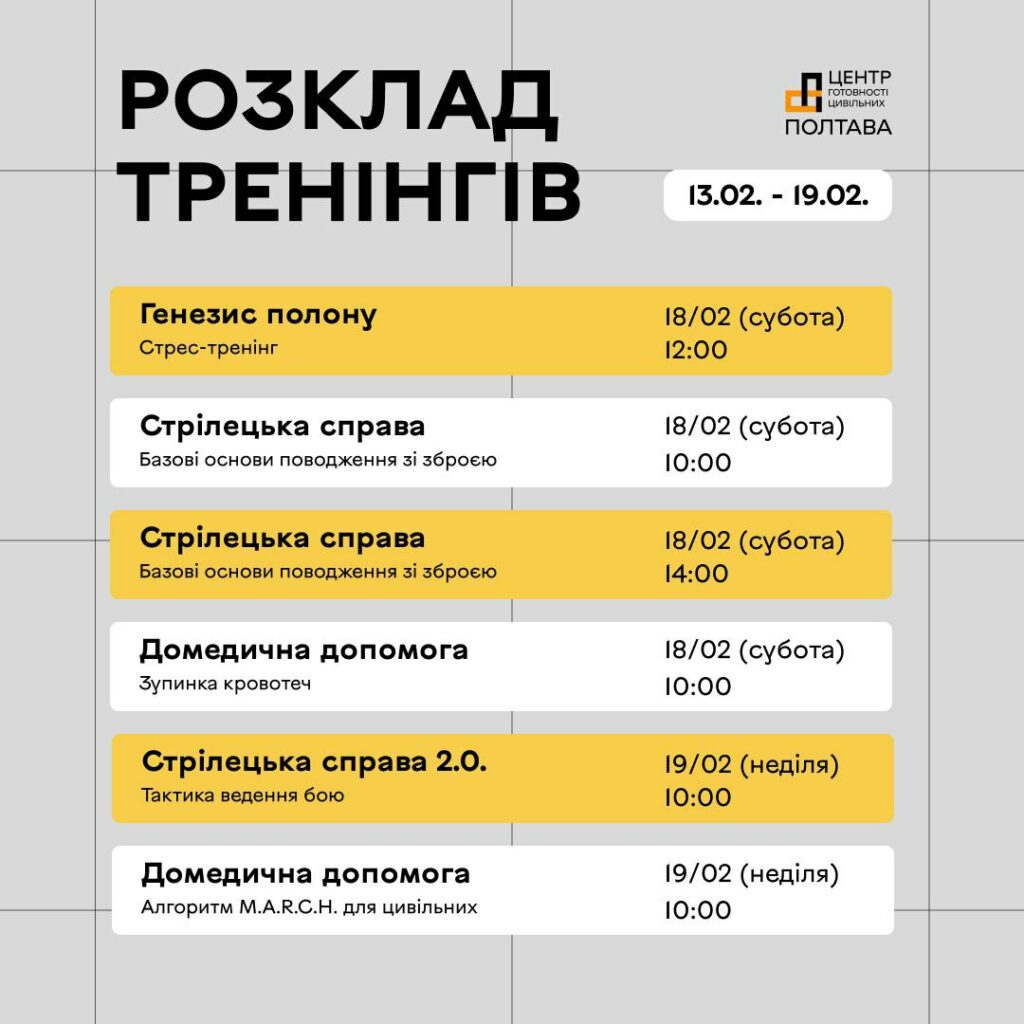 Стрілецька справа, правила на випадок полону і домедична допомога. Розклад занять у Полтаві для цивільних