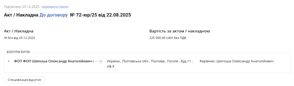 Згідно з даними державного порталу публічних фінансів Spending, ФОП Шипоша отримав 830 тис. грн, що становить близько 90% від загальної вартості договорів. Кошти були сплачені кількома траншами за актами накладних: 190 тис. грн, 225 тис. грн, ще 225 тис. грн і знову 190 тис. грн. Отже, після продовження строків виконання робіт підряднику виплатили основну частину грошей авансом.