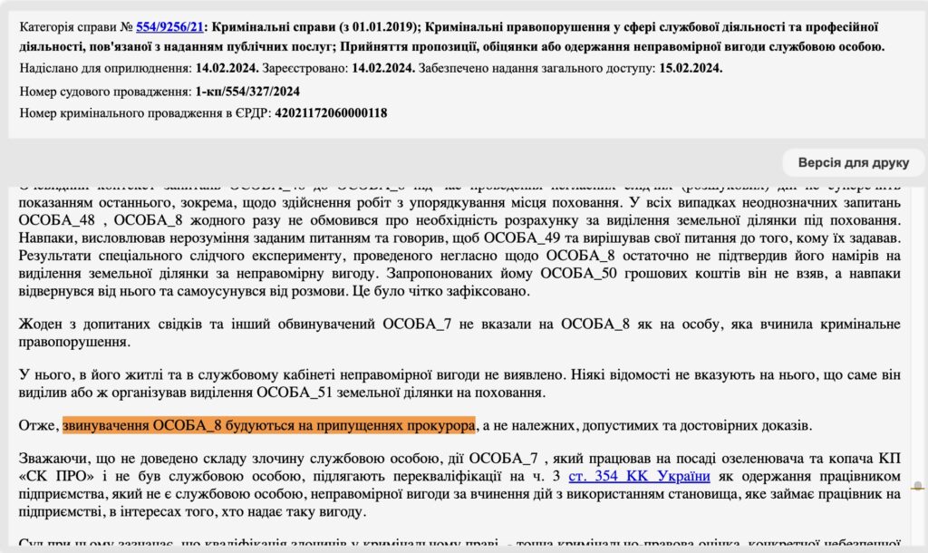Натомість на 8 тис. 500 грн оштрафувала озеленювача ритуальної служби. Хоч він не був службовцем, саме його визнали винним у корупційній схемі. Озеленювач виступав посередником й самостійно оголосив про суму хабаря за місця поховання.