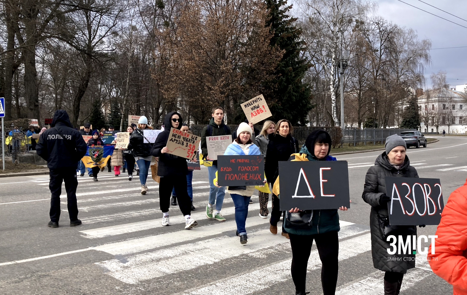 Полтавці прийшли з плакатами в Корпусний парк, а далі колона рушила під стіни Полтавської міської ради. Вони вимагають повернути з неволі військовополонених.