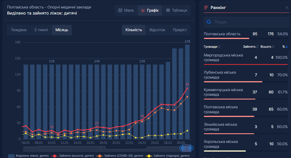 За даними РНБО, станом на 31 січня у «ковідних» стаціонарах лікарень Полтавщини отримують допомогу 95 дітей (для порівняння: 24 січня у лікарнях перебували 36 дітей). Директор ДОЗ каже, що частина кисневозалежних серед хворих не є значною.