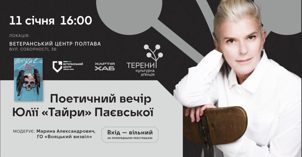 11 січня 2026 року о 16:00 відбудеться поетичний вечір Юлії «Тайри» Паєвської. ого проведуть у Ветеранському центрі (вул. Соборності, 36). Вхід – за попередньою реєстрацією за посиланням.