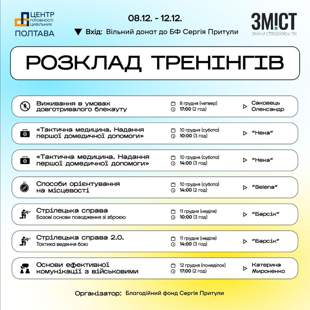 З 5 по 12 грудня «Центр готовності цивільних» підготував для населення Полтави 7 тренінгів. У розкладі, окрім традиційних, з’явилася нова тема – про підготовку до можливого довготривалого відключення світла.