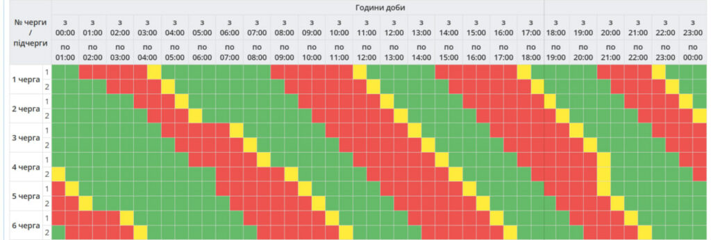 Знеструмлення охоплюють шість черг споживачів. Найменше відключень очікують на споживачів 2-ї черги обох підчерг. Вони триватимуть від 1,5 год до 3 год для кожної з черг у різний час доби: