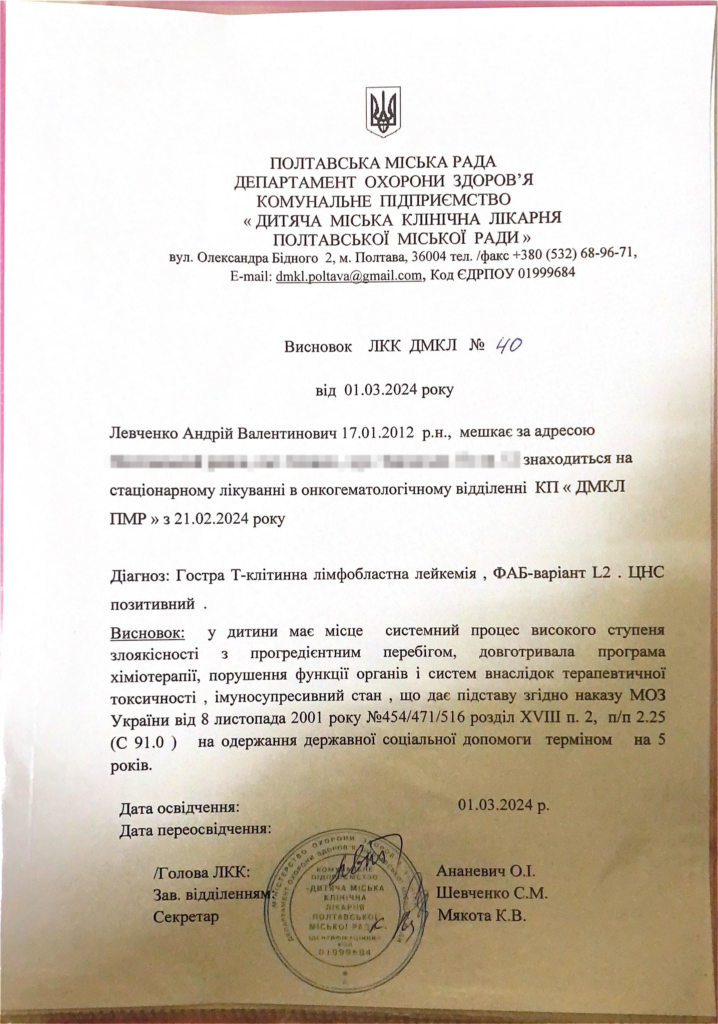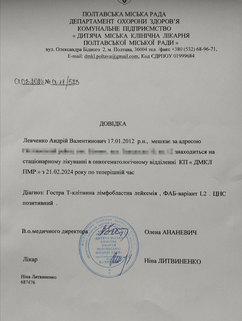 В Андрія Левченка з Біликів діагностували гостру Т-клітинну лейкемію. Хлопчикові необхідно термінового пройти курс лікування.