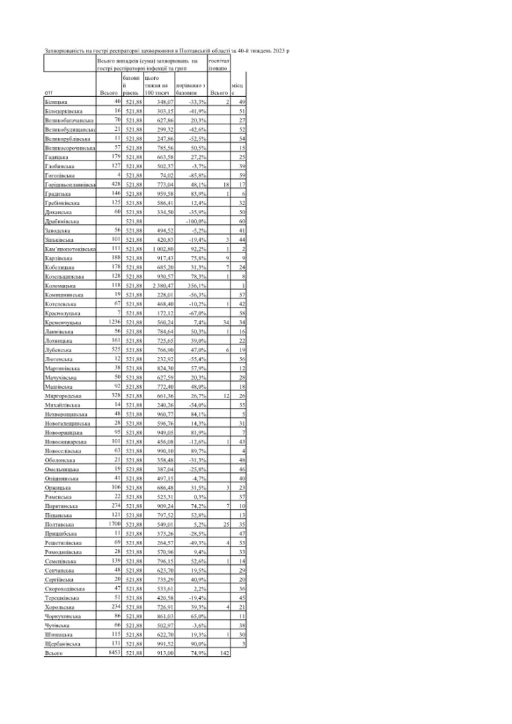 - Карлівська – 917,43 на 100 тисяч населення (на 75,8% більше), госпіталізували 9 людей;