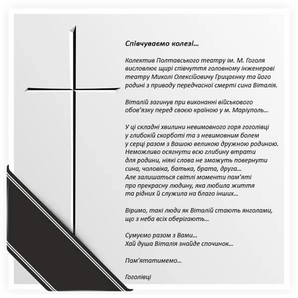 Головний інженер театру Микола Грицаєнко та його родина отримали звістку про загибель сина 20 березня. Він був заступником командира полку з бойової підготовки і під час виконання завдання він поліг у бою. Адміністрація та працівники театру намагатимуться зробити усе можливе, щоб повернути тіло загиблого воїна, щоб рідні мали змогу з ним попрощатися.