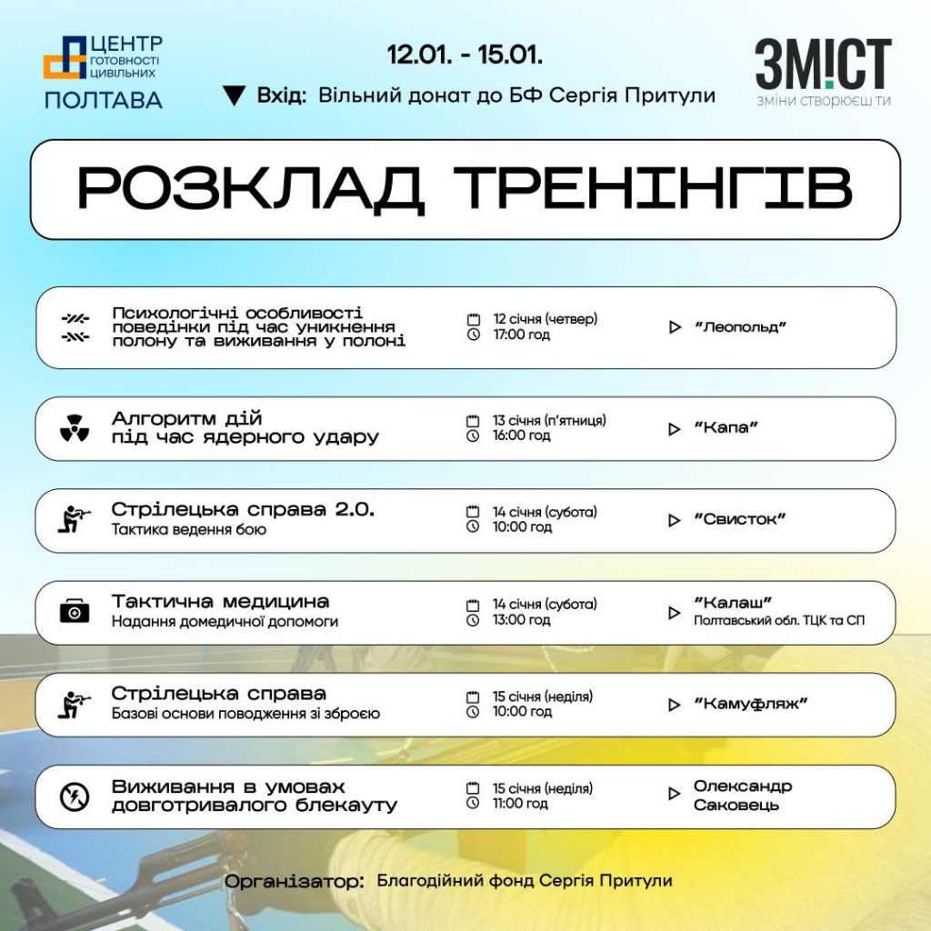 З 12 по 15 січня «Центр готовності цивільних» проведе 6 тренінгів. Серед нових тем – «Психологічні особливості поведінки під час уникнення полону та виживання у полоні» та «Алгоритм дій під час ядерного удару».
