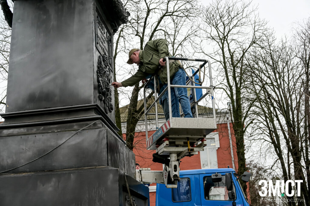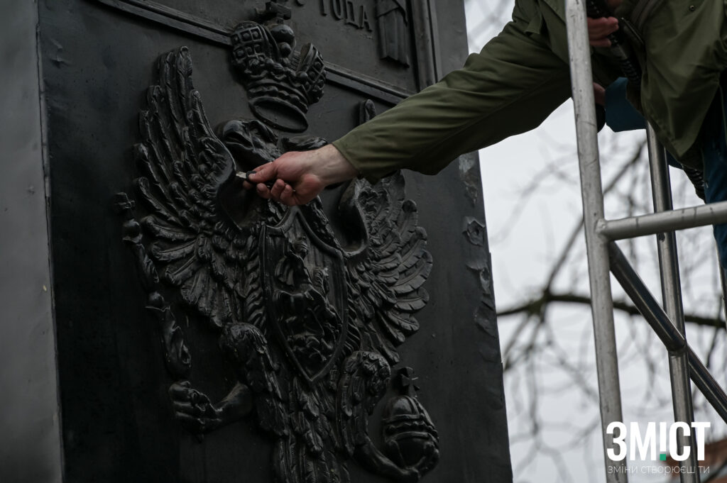 2 травня розпочали демонтаж. Цей памʼятник визнали імперським. Першим з монументу забрали тризуб, який встановили активісти. На місці працюють комунальні служби та поліція, повідомила кореспондентка ЗМІСТу.