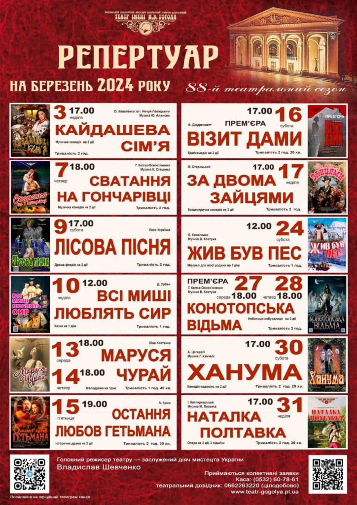 Про це повідомили в полтавському театрі імені Миколи Гоголя. Афіша березня пропонує до перегляду 12 вистав, серед яких дві дитячі.