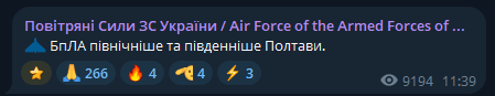 О 11:39 Повітряні Сили повідомили, що дрони кружляють північніше та південніше Полтави. За даними моніторингових каналів, три «Гербери» кружляли над та біля Полтави. Місцева влада просить до відбою повітряної тривоги перебувати у безпечних місцях.